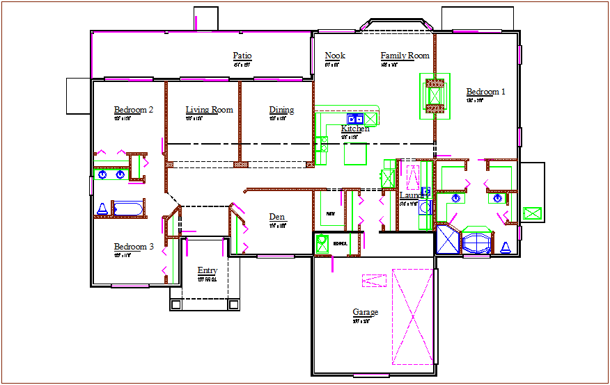 Family house plan dwg file in plan view with wall and area distribution view and entry way,bedroom,family room,dining area and kitchen and living room and washing area view.