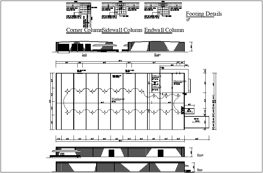 Corner column side wall column end wall column plan view details dwg file, Corner column side wall column end wall column plan view with footing details and dimension, elevation & side elevation, column section & side section in details, all plan dimension detail
