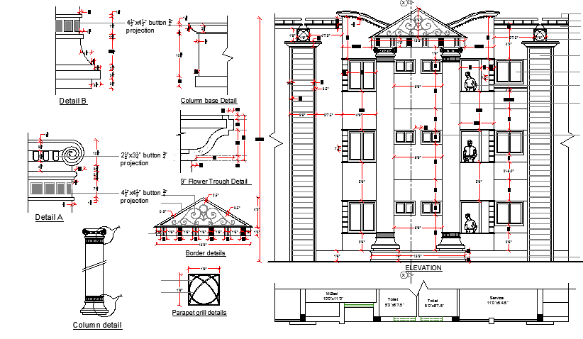 Front elevation with roof, column and beam details of residential building dwg file
