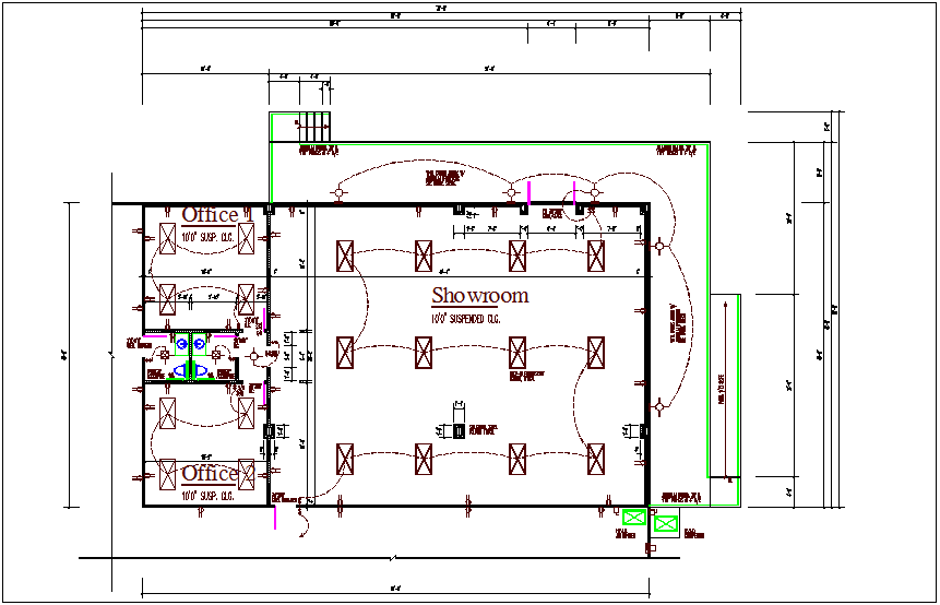 Commercial building electrical plan layout details dwg file, Commercial building electrical plan layout details in showroom electrical plan details with big light and office building plan electrical plan details, showroom plan, and office plan dimension details