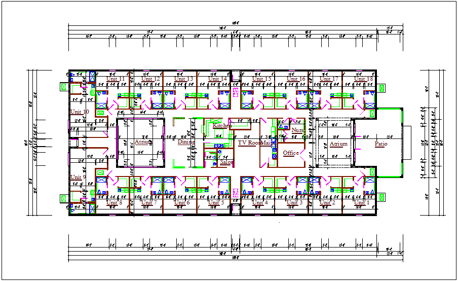 Commercial building plan layout details dwg file, Commercial building plan layout details office plan details with unit 1 & unit 18, dining room, tv room, toilet, balcony with projection, salon, office plan dimension details
