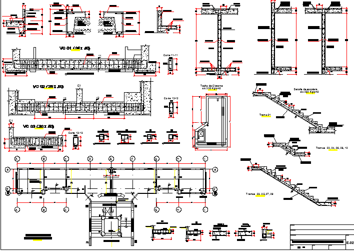 Six floor residential building staircase and construction details that includes staircase construction with steps details, column construction details, beam construction details, material used details, cuts, measurement details and much more of construction details.