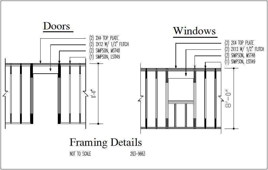 Framing plan view details dwg file, Framing plan view details indoor elevation & side elevation, door plate, 8’0” height elevation, 7’0” door, window elevation & side elevation, window 4’0” sill level, door, and window dimension detail