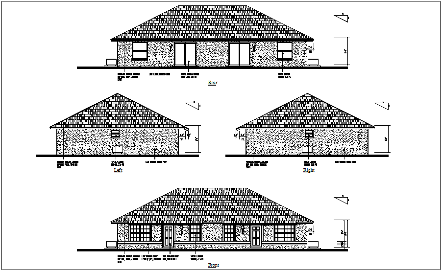 Bungalow plan details dwg files, Bungalow plan details in elevation all side details, bungalow elevation naming specification in the door, vent in toilet, window, all elevation in dimension details, bungalow front elevation & side elevation & back elevation,