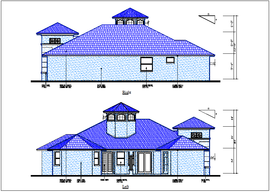 Residential house front and rear elevation view detail dwg file, Residential house elevation view detail with specification detail