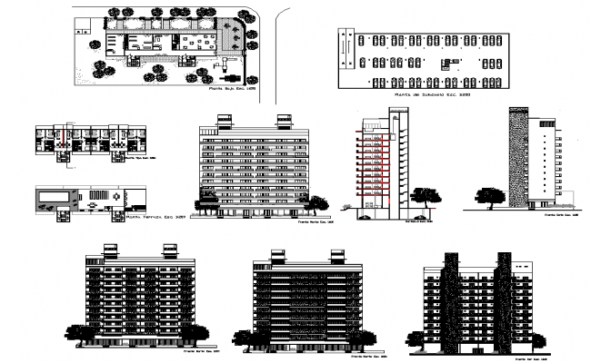 This Modern 3 BHK 13-story apartment CAD layout showcases a well-organized architectural building design with complete floor plans, front elevations, and side sectional views. The drawing includes precise measurements for each level, providing a clear understanding of spatial organization and vertical design structure. Every 3 BHK apartment layout emphasizes functional interiors, optimized ventilation, and open balcony arrangements for natural light and comfort. The high-rise structure features parking levels, service cores, and façade elements designed to meet modern residential standards.