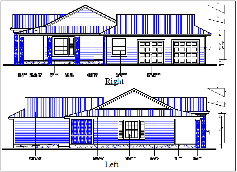 House elevation view detail dwg file, Residential house elevation view detail with specification detail, door window and garage door elevation view detail specification, elevation and side elevation view detail, dimension detail etc