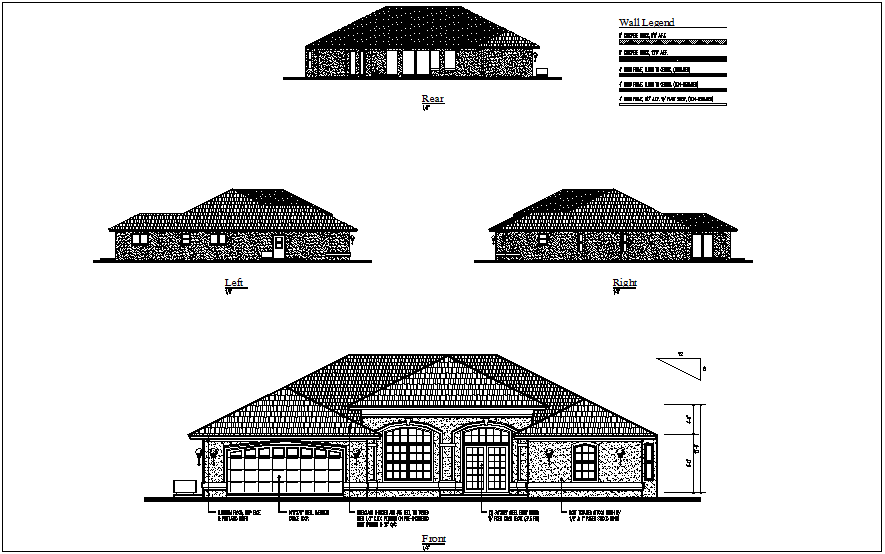 Rear,left,right and front view of house dwg file in rear view with wall,door and window view and view of left,right and front view.