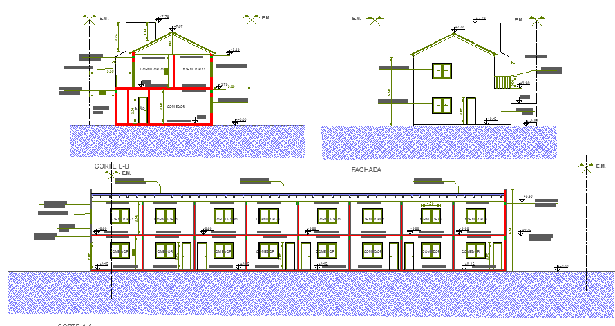 Elevation and section details of eight units group habitation that includes front elevation, section cuts with doors and window view, floor view, staircase view, roof or terrace view, wall design and much more of habitation center details.