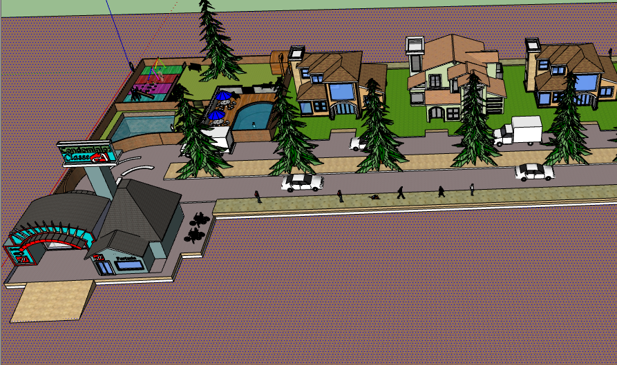 3d design of multi family housing bungalow colony that includes top view with main entrance gate with security cabin, tree view, parking area, staircase view, roads, bungalow view and much more of bungalow design.