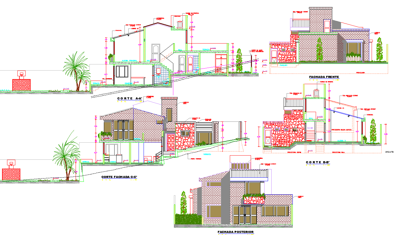 Section plan and Elevation design House dwg file. the architecture section plan and elevation design along with dimension detail and landscaping design of house project.