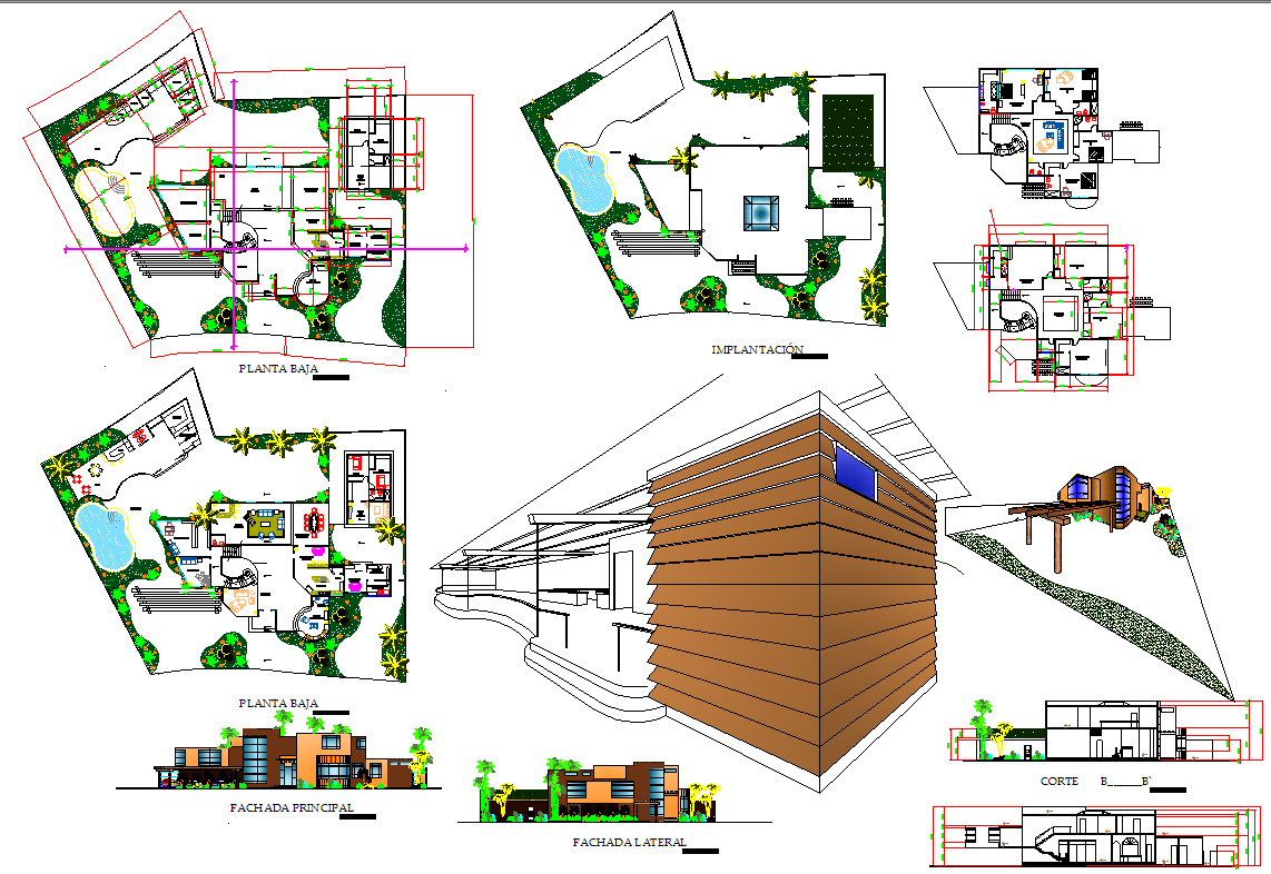 This elegant modern house CAD design plan provides a comprehensive AutoCAD DWG layout featuring detailed floor plans, elevations, and 3D perspectives for luxury residential living. The design showcases spacious interiors, landscape details, pool areas, and outdoor seating arrangements, ensuring a seamless blend of style and functionality. Each layout emphasizes modern architectural concepts, including open-plan living rooms, modular kitchens, and well-proportioned bedrooms that highlight comfort and aesthetic appeal.