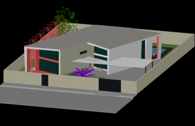 3d Modern Residential project dwg file. the modern architecture 3d model of the residential bungalow also has a swimming pool and landscaping design in cad file.