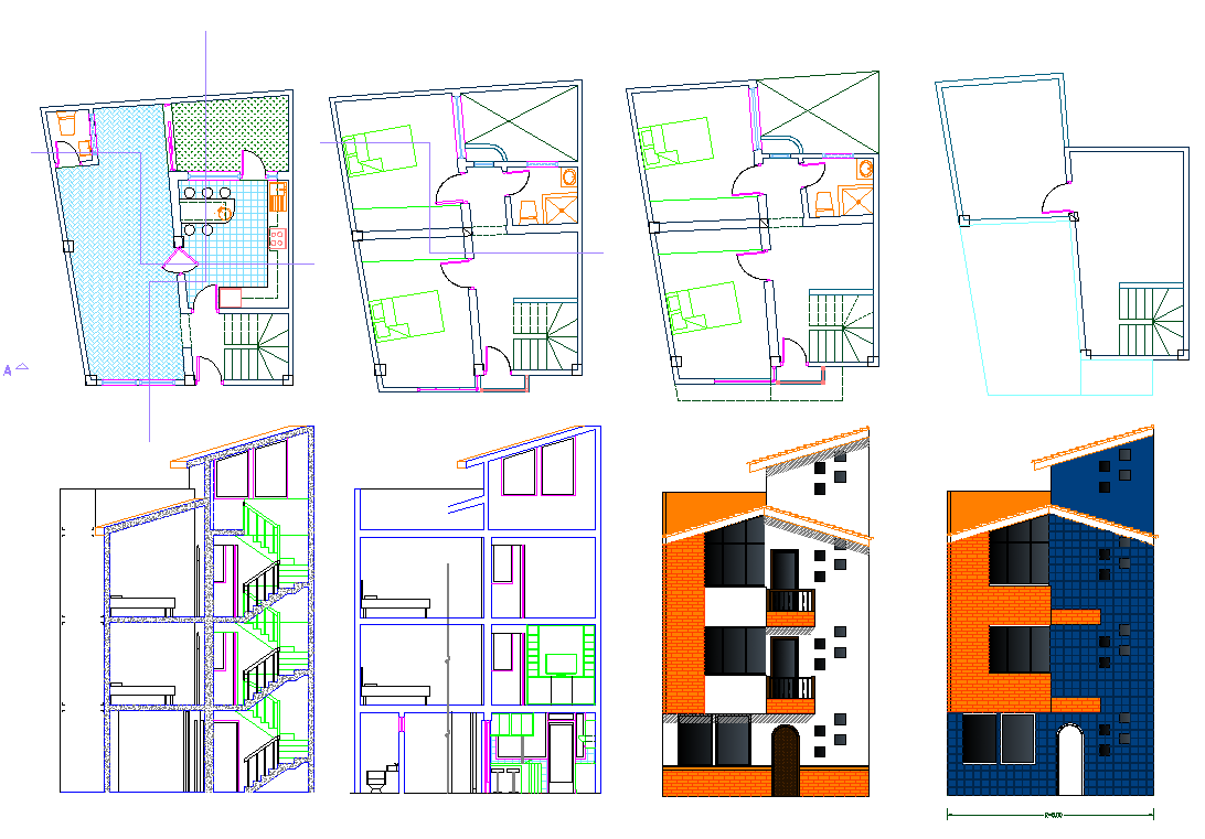 3 Level House project detail view. the architecture layout plan of 3 level floors along with furniture detail, section plan and elevation design of house project.