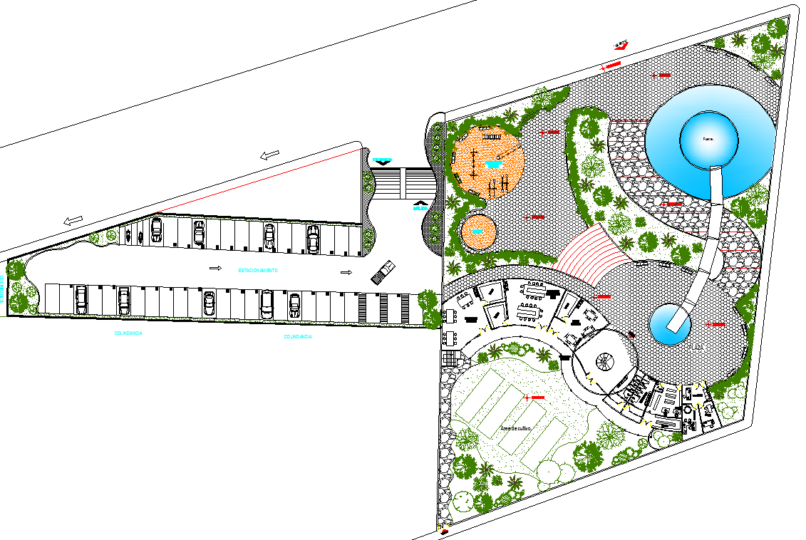 Resort design dwg file. the architecture layout of a top view includes vehicle parking, swimming pool cafeteria, and landscaping design of resort project.