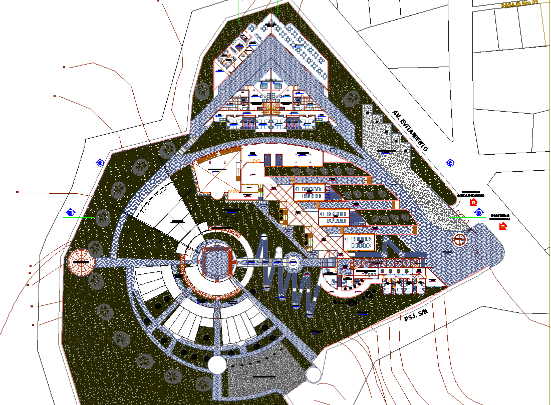 the architecture layout plan of top view cafeteria, bedrooms, and landscaping design with much more detailing in cad file.