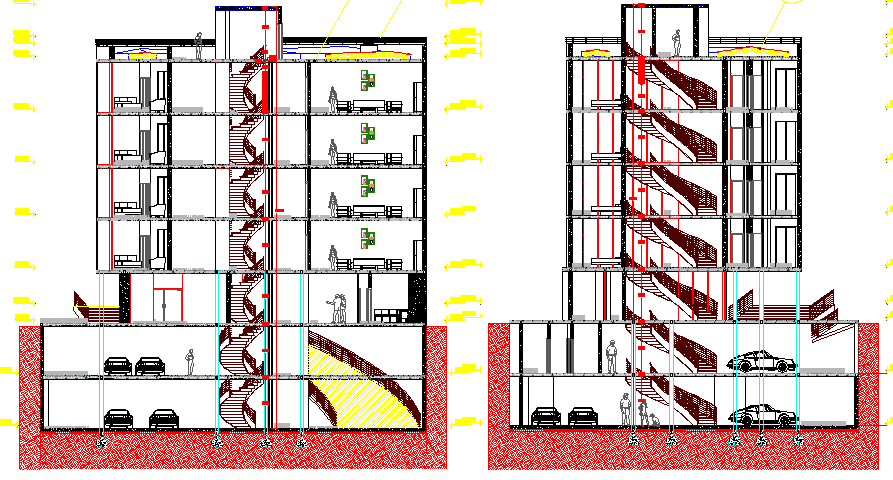 Front and back sectional view of residential housing building that includes floor view, doors and windows view, detailed staircase view, basement car parking view with staircase, family hall view, bedrooms view, balcony view and much more of building section.