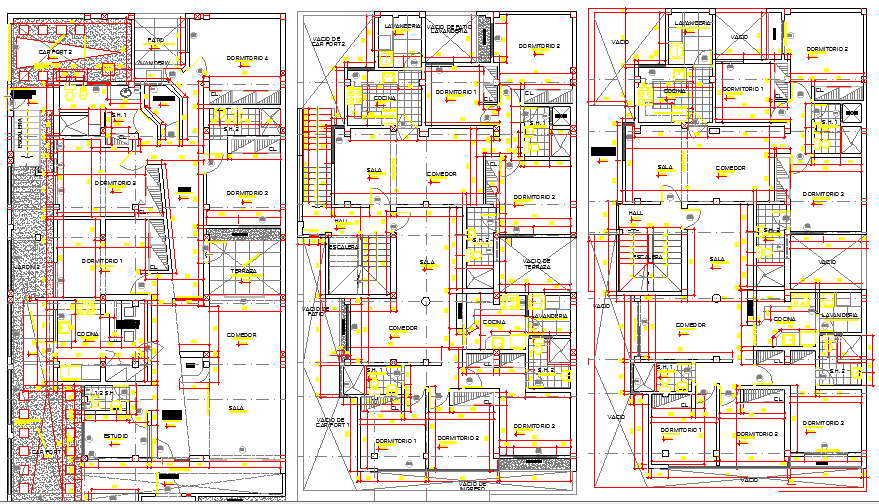 Floor plan details of multi-flooring housing apartment that includes car parking lot, main entry door, family hall, living room, kitchen, dining area, laundry area, bedroom, master bedroom, passage, bathroom and toilets, study room and much more of floor plan details.