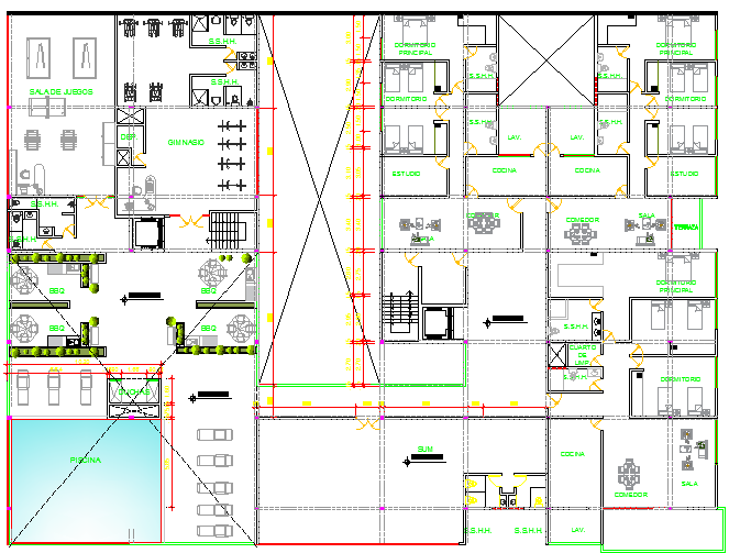 Multi-family ad multi-flooring housing building architecture layout that includes main entry door, family hall, swimming pool, living room, kitchen, dining area, laundry area, bedroom, master bedroom, passage, bathroom and toilets, study room and much more of layout plan details.