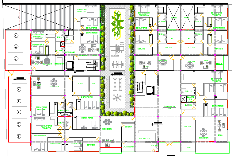 Structure with center garden multi-family ad multi-flooring housing building dwg file.