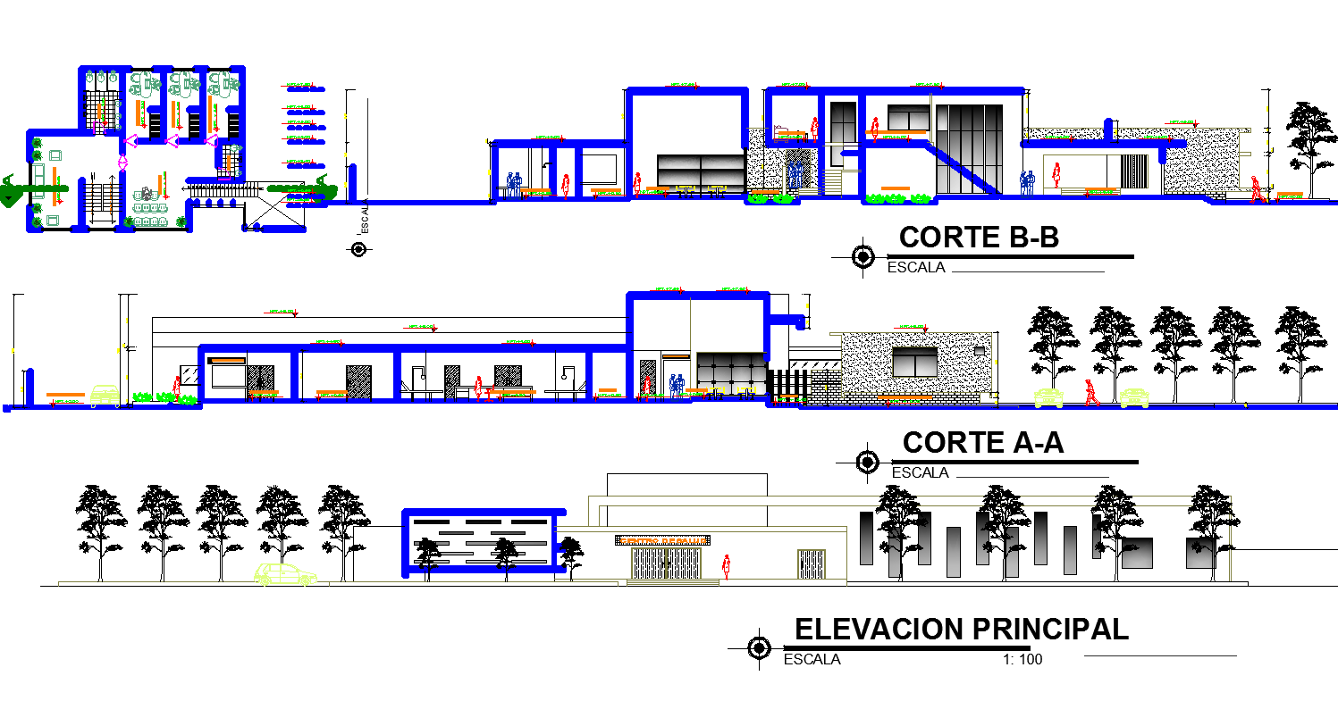 Layout plan and elevation design of building dwg file. find here architecture layout of the corporate office building, section plan, and elevation design.