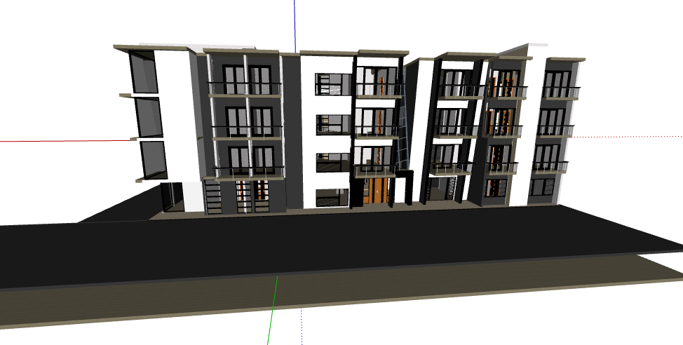 3d design of five levels multi-family residential building that includes front view with doors and windows, floor view, balcony view, terrace view, staircase view and much more of residential building design.