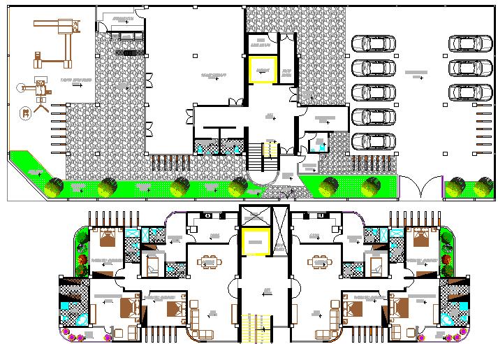 Ground and first floor layout plan details of multi-flooring apartment flats dwg file.