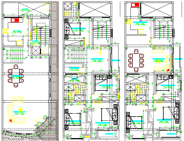 Ground, first, second and top floor plan view of four level housing building dwg file.