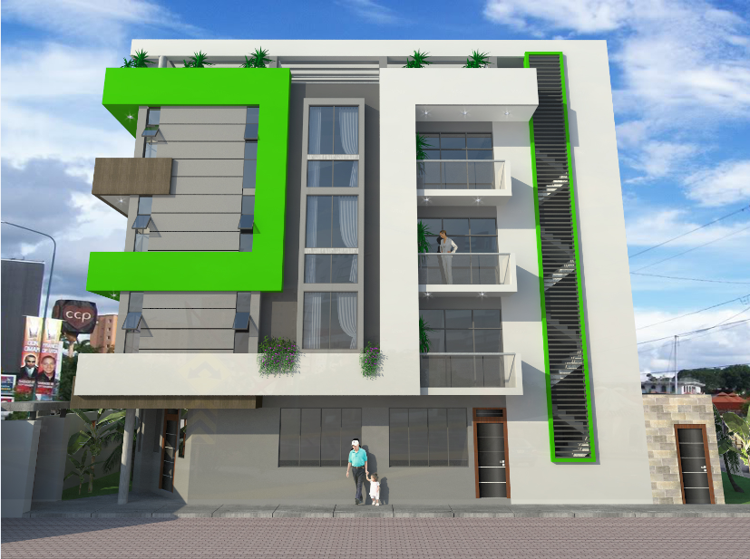 3d design of multi-flooring housing building that includes tree view, staircase view, balcony view, doors and windows, view, roof or terrace view, main entry door and much more of 3d housing building.