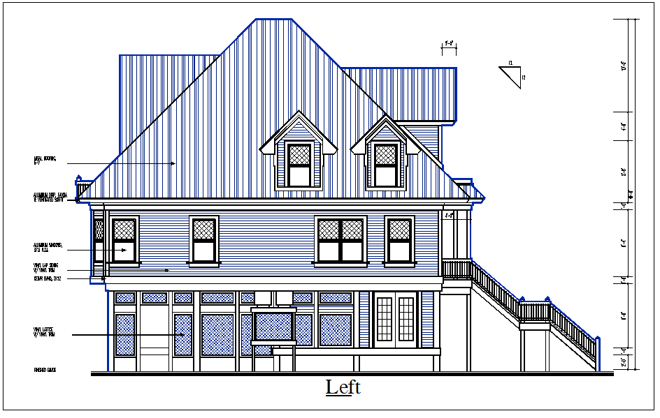Elevation view of bungalow detail dwg file, Elevation view of bungalow detail with specification detail, door&window specification detail, roof material detail etc