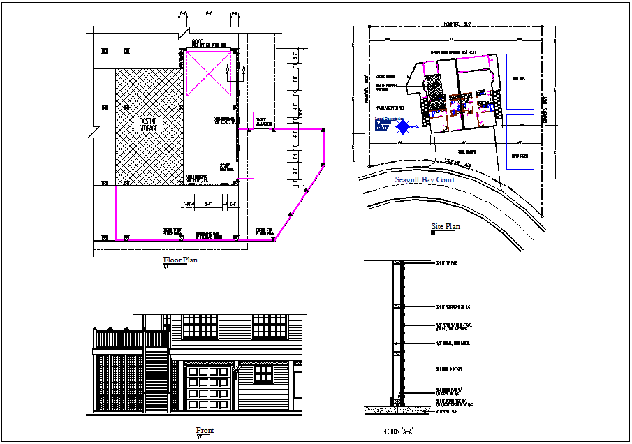 House plan view and site plan view detail with section view of wall structure detail dwg file