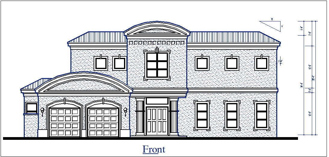 Front elevation view of bungalow dwg file, Front elevation view of bungalow with elevated height measurement, garage door, door & window elevation view