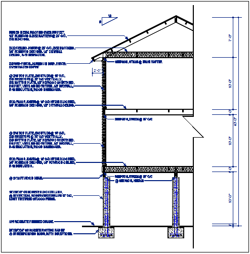 Wall section detail with foundation details and floor divided naming all of the material, with dimension details