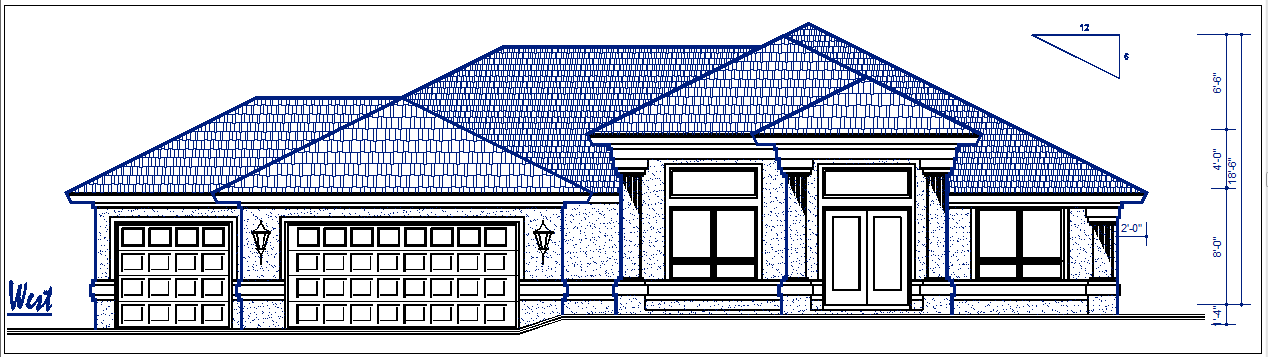 Front elevation view of bungalow dwg file, Front elevation view of bungalow with elevated height measurement, garage door, door & window elevation view