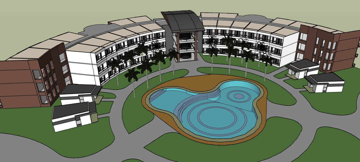 3d design of three star hotel building project that includes top view with main entry door, swimming pool, tree view, landscaping, floor view, balcony view and much more of hotel project.
