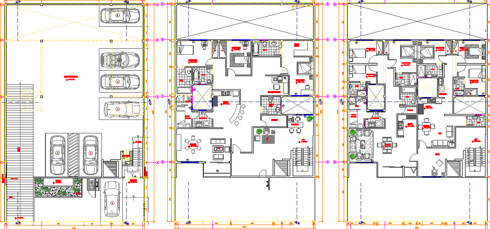 Three flooring bungalow floor plan details that includes ground floor plan with basement car parking area, first and top floor with main entry door, family hall, living room, kitchen, dining area, laundry area, bedrooms, terrace, toilets and bathrooms and much more of bungalow floor plan details.