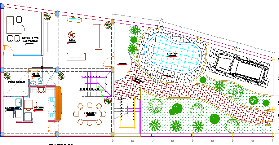 Landscaping and structure details of single family bungalows dwg file