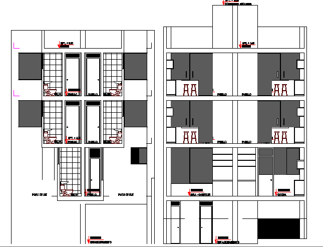 Side sectional view of multi-family residential building that includes a detailed view of floor view, staircase view, doors and windows view, balcony view, roof and terrace view, main entry gate, family hall, toilets, kitchen, dining area and much more of building section design.