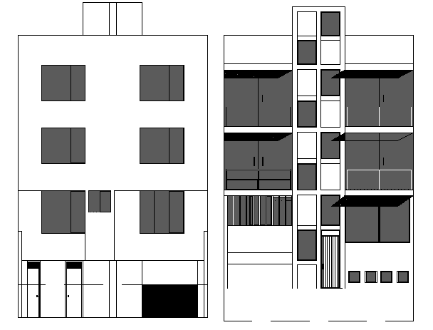 Multi-flooring residential building side elevation details that includes a detailed view of doors and window view, staircase view, doors and windows view, balcony view, main entry gate, roof or terrace view and much more of residential building elevation details.