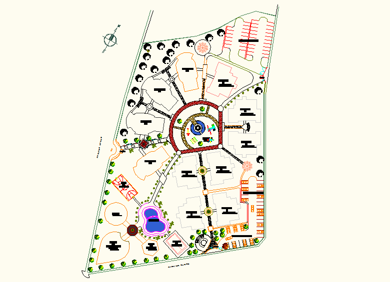 layout plan dwg file, here there is a top view layout of a hotel, complete detail of landscaping, furniture etc