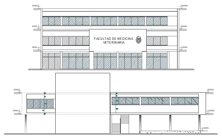 Medical college front and back elevation details that includes front elevation, back elevation, wall design, name hoarding plate, wall design, doors and windows view, staircase view and much more of medical college elevation.