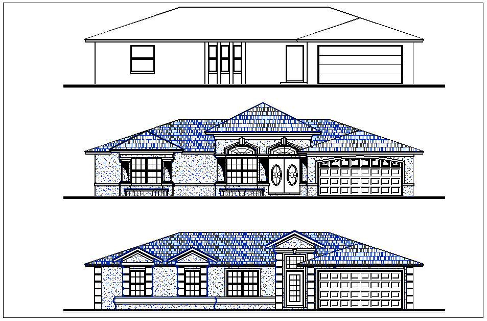 Elevation view of bungalow dwg file, bungalow front elevation and rear elevation view detail
