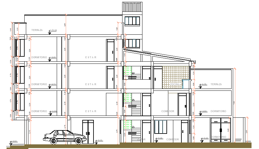 Four flooring residential building sectional view basement car parking area, balcony view, floor view, doors and windows view, indoor and outdoor staircase view, roof or terrace view and much more of building section.