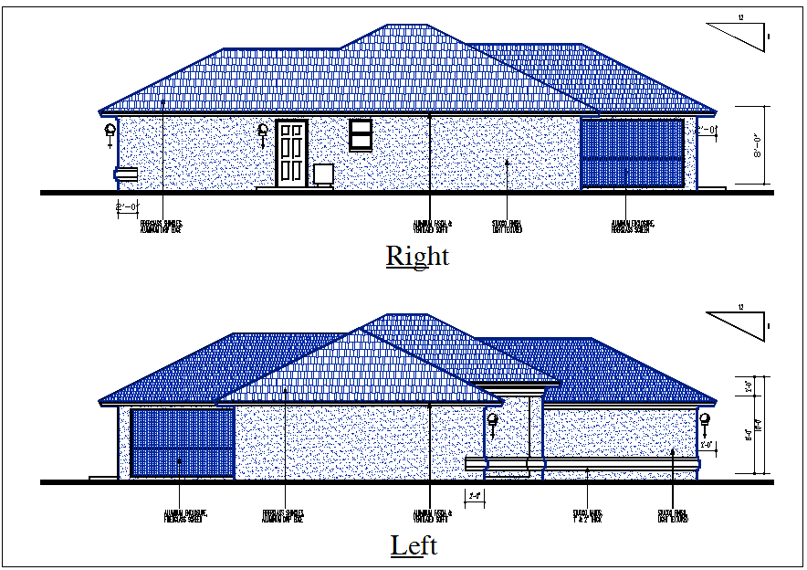 house elevation view detail dwg file, Residential house elevation view detail with specification detail, door window and garage door elevation view, lattice vinyl layer of wall, metal roofing detail, left elevation and right elevation view detail