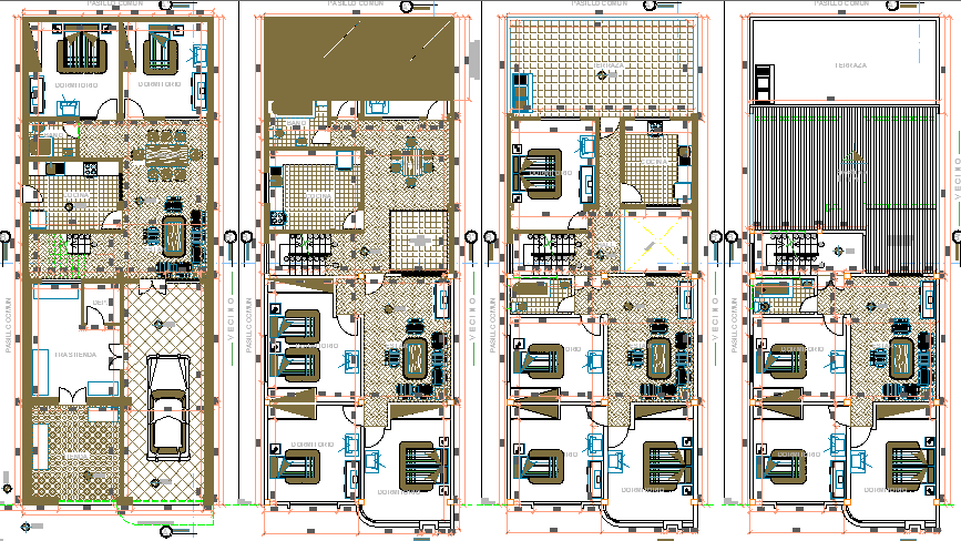 Ground, first, second and top floor plan view of four level housing building dwg file.