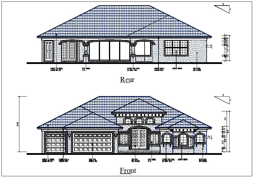 house elevation view detail dwg file, Residential house elevation view detail with specification detail, door window elevation view detail specification, front elevation and rear elevation view detail, dimension detail etc