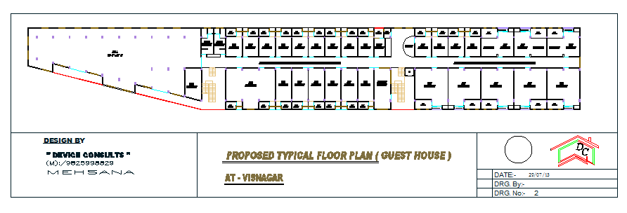 Here the Proposed Typical floor layout plan of guest house design drawing with room size 114 sq.ft and also restaurant design drawing in this auto cad file.