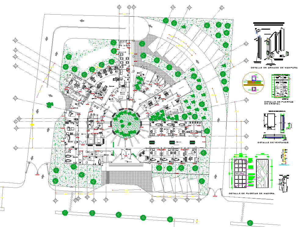 Top View of Office Layout plan dwg file. the architecture layout plan along with furniture detail and landscaping design and much more detailing in cad file.