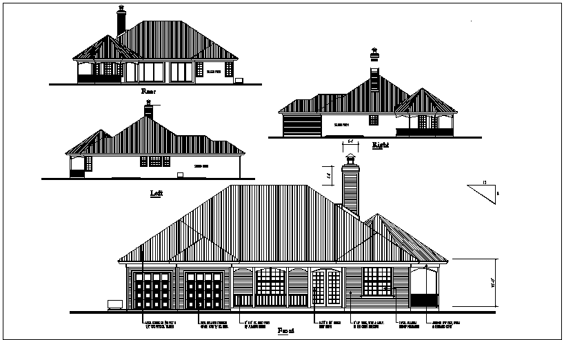 House elevation view detail dwg file, Residential house elevation view detail with specification detail, door window and garage door elevation view detail specification, front elevation and side elevation view and right and back elevation detail, dimension detail etc