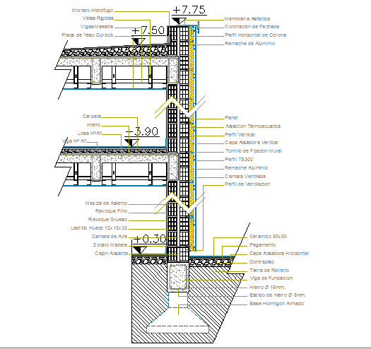 Column construction details of court room that includes a detailed view panel, thermoplastic isolation, vertical profile, vertical insulating clock, mural fixing screw, aluminium rivet, ventilation profile, ceramic and much more of column details.